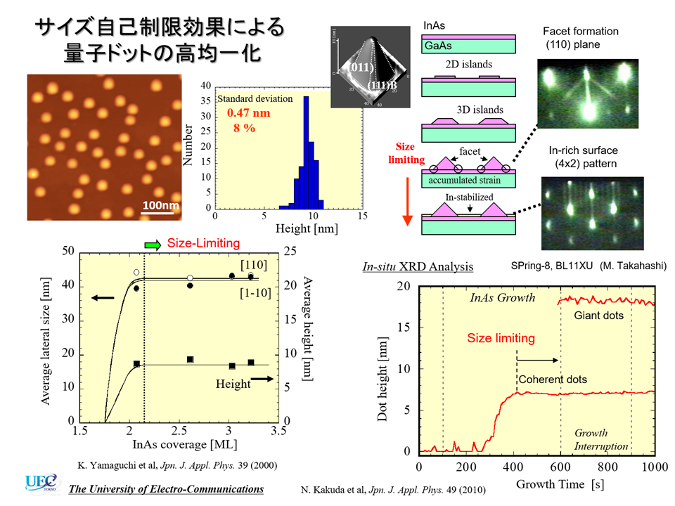 本研究では、上記のSKモードを利用した自己組織化成長により高密度で良質なInAs量子ドットを作製しますが、デバイス作製の観点においては、 全ての量子ドットのサイズを均一に揃える必要があります。これまでのSKモードによる作製ではサイズの不均一性が大きな問題点でしたが、 本研究では、SK成長条件を詳細に調べ、量子ドット構造の形成メカニズムについて検討してきました。 2000年には、量子ドット構造が安定な微小結晶面に覆われ、サイズが自己停止する現象(サイズ自己制限効果)を初めて発見し、世界トップクラスの高均一な量子ドット構造を 作製することに成功しました(ref.1)。 また2006年には、高均一な量子ドットの層上にさらに量子ドット層を近接積層させた構造を作製し、さらに均一性を向上させることに成功しています。 2009年には、高密度でかつ高均一な量子ドットの作製法を開発し、量子ドットの国際会議にて表彰されました(ref.3)。 本研究テーマでは、さらに超高均一な量子ドット構造の作製制御法の開発を目指し、量子ドットデバイスの応用展開を目的としています。